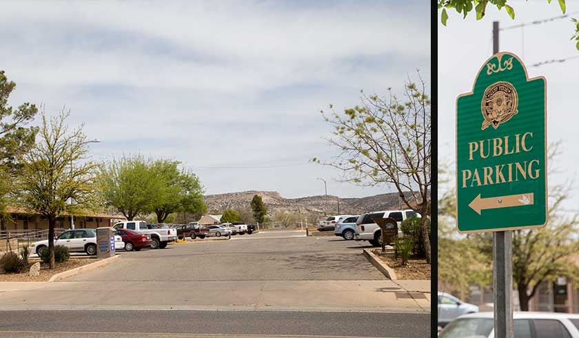 Free public parking is available in the lots indicated by the signs along Main St. There is a small paved lot outside of the courthouse that is shared by other city agencies.