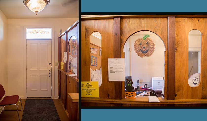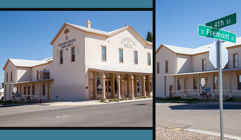 The entrance to the Tombstone Magistrate Courthouse is located off of 4th St., north of Fremont Street. It is located on the western side of Schieffelin Hall. There is an access ramp and stairs leading to the main door.