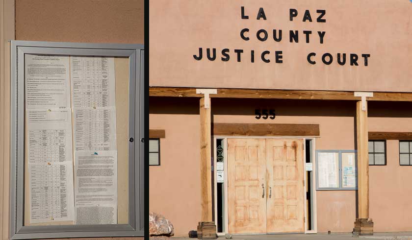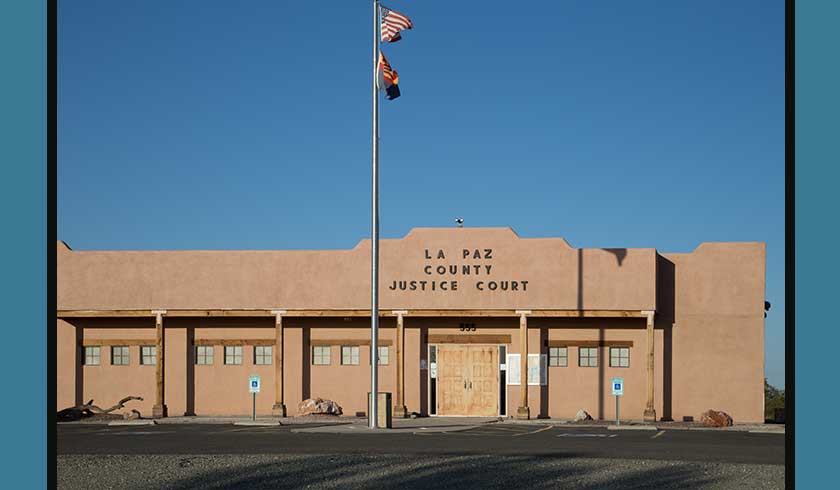 The Quartzsite Justice Court, in Quartzsite, Arizona is off of Plymouth Avenue and Quail Trail Street. It is across the street from the Town Hall, on the north-east corner.