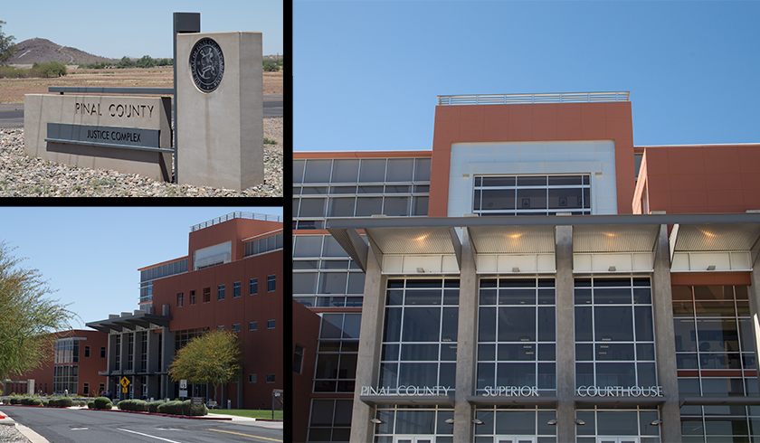 The Pinal Superior Courthouse is located at Highway 79 and Jason Lopez Circle. It is on the east-side of Highway 79. The Justice Complex contains multiple buildings, it is building A. The courthouse entrance faces north.