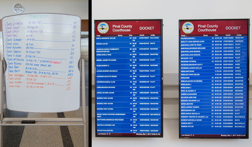 The daily calendar is available on the screens in the 1st floor lobby area. Also on the 1st floor, a portable wipe board indicates what judges are presiding over which courtroom throughout the day. Access to the courthouse calendar is also available online here.