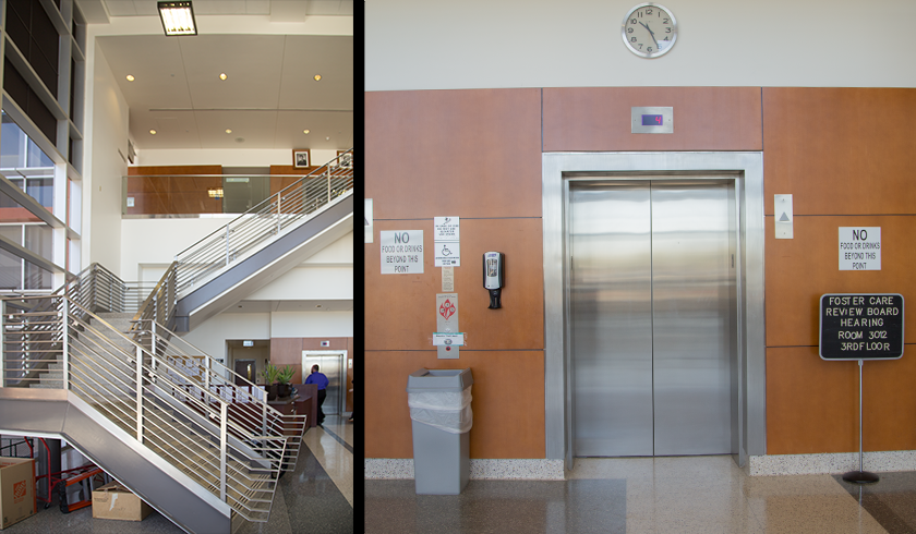 The four story courthouse offers a staircase and three elevators to access the upper floors. The elevators are visible from the entrance. If you are in need of further assistance please contact the Clerk of the Court with your specific requests.
