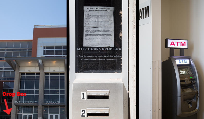 For filing or making non-cash payments afterhours, there is a drop-box located to the east of the courthouse entrance. These are picked up every morning; the date stamped on the document is considered the file date. There is an ATM located in the lobby.