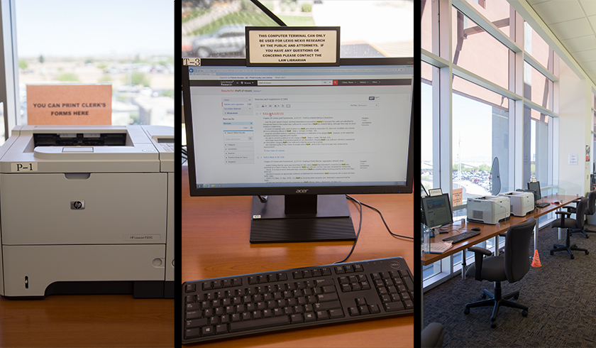 Public computers are avilable in the Law Library for accessing court forms, West Law, child support worksheets, and probate trainings. These computers allow for forms to be printed for free. There are computers dedicated to specific tasks, so consult the desk or the signs posted as to which computer to use.