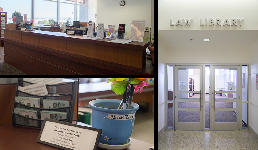 The Pinal Law Library is located to the west on the 2nd floor. At the desk you will find guidance to resources and materials that can assist with your situation. The library only accepts cash for copies; copies are $.20 a page.