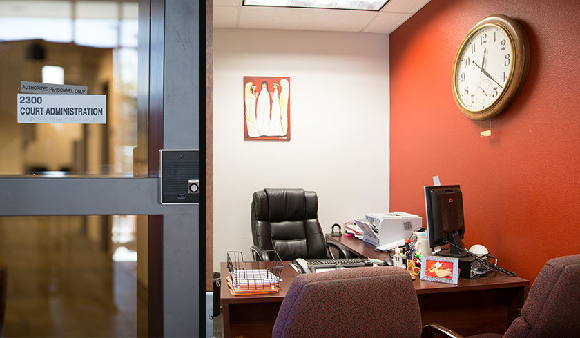 The Court Administration Office is visited for a variety of reasons; these include printing forms and arranging payment plans. To access the court administration office, the customer presses the intercom outside of the entrance and waits to be buzzed in. The office is located directly across from security.