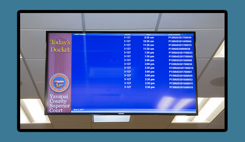 The daily calendar is available on the screen hanging in the lobby. Access to the courthouse calendar is also available online here.