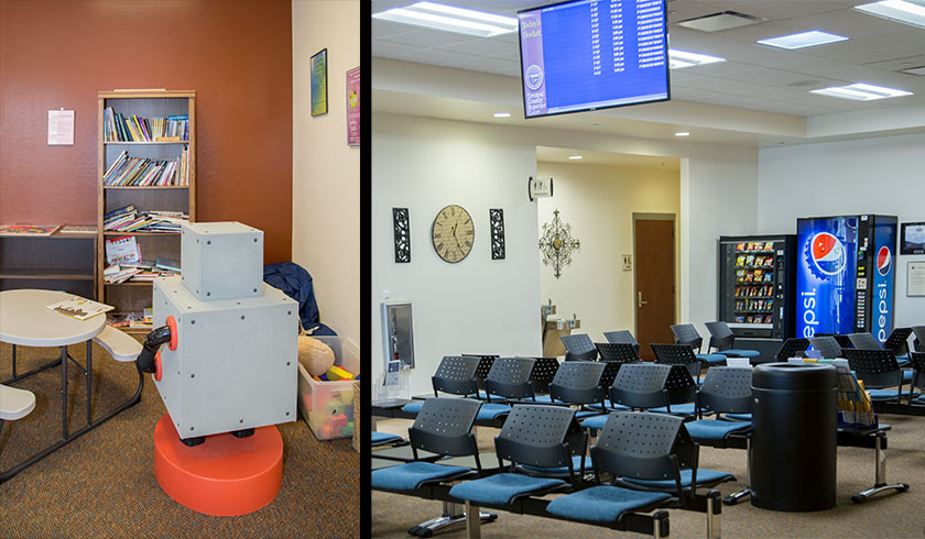There is a large waiting area in the Center where youth and families can wait for meetings, hearings, or trials. There is an area with activities for children.