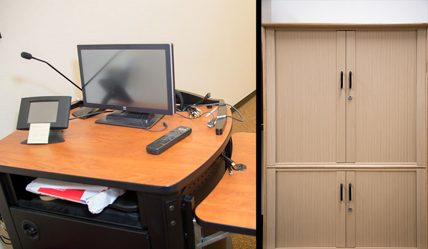 Audio/Visual carts, that are laptop capable, are available upon request for those in need. Courtrooms are equipped with sound amplifiers for those with hearing impairments. A public computer terminal is available for individuals to look up case information. For access, please speak with the clerk and they can unlock the cabinet.