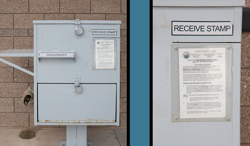 For filing or making non-cash payments afterhours, there is a drop-box located to the west of the courthouse entrance. These are picked up every morning; the date stamped on the document is considered the file date.